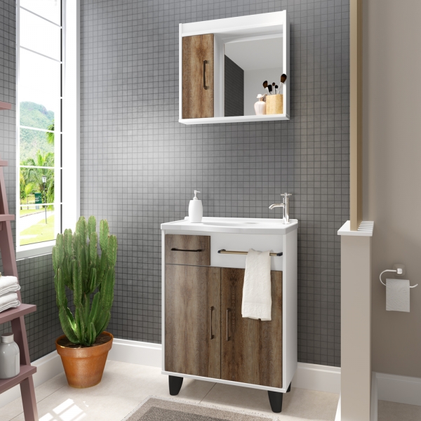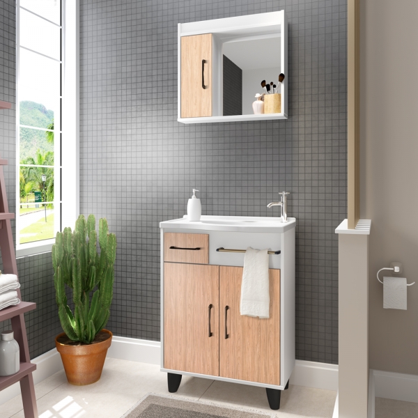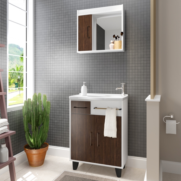 Conjunto/Gabinete para banheiro com tampo de marmorite. O S12 possibilita a praticidade e a customização, otimizando o espaço do ambiente.
